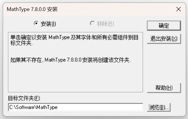 ② 关键注意事项:安装路径禁止包含中文字符(例如避免 “C:\ 软件 \MathType”,可改为 “C:\Software\MathType”)。