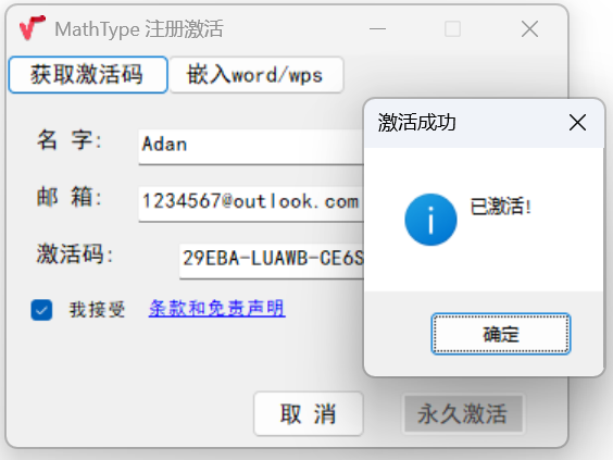 ② 输入输入姓名、邮箱、激活注册码等信息,点击“永久激活”(若无激活注册码:点击界面上方 “获取激活码”按钮,按指引完成拿到激活注册码后再输入。)
